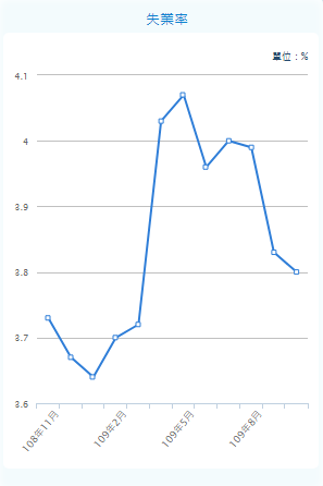 - 109年10月就業人數1,151萬人,失業人數45萬5千人,失業率3.80%,季調失業率3.77%,勞動力參與率為59.13%。