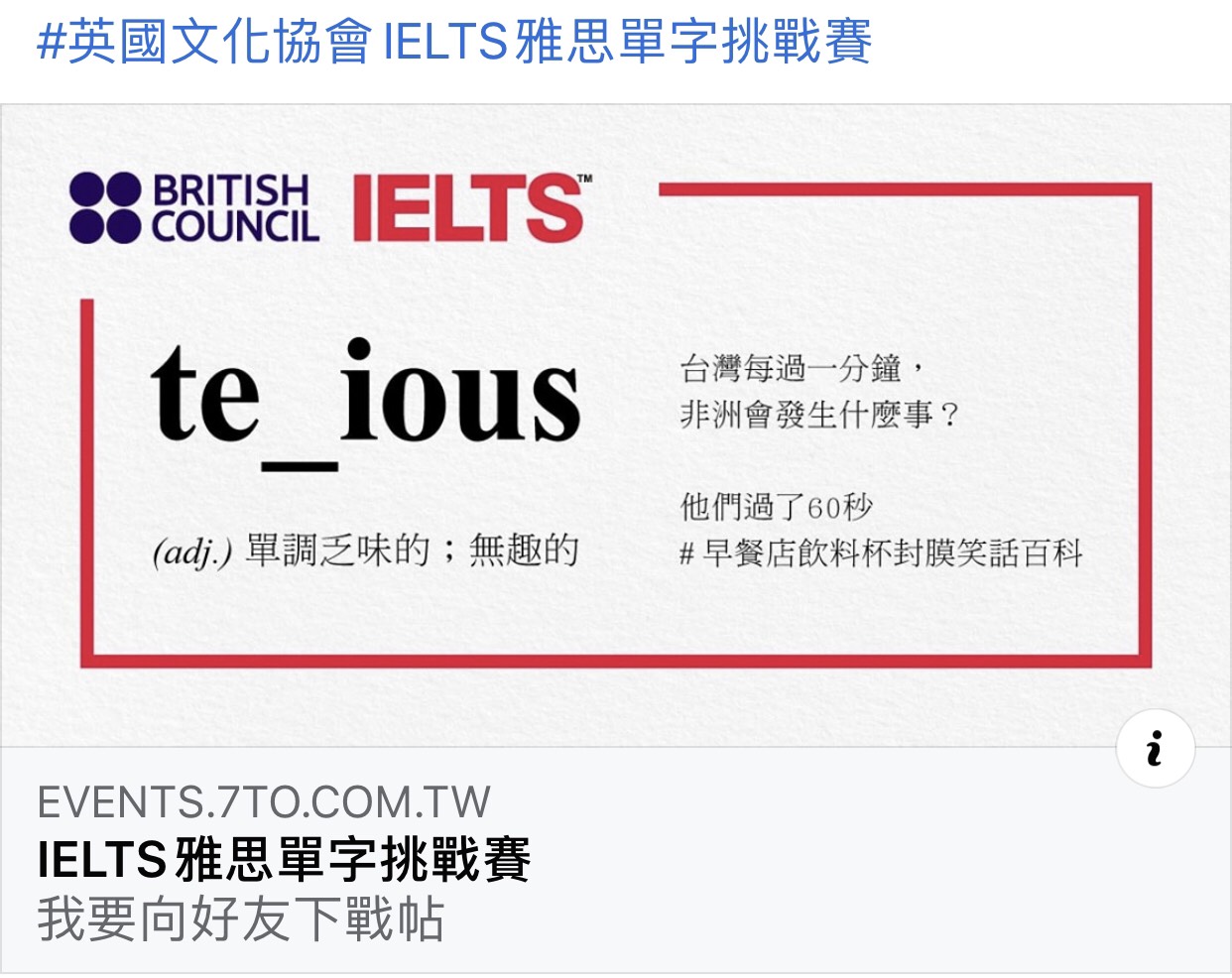於貼文下方留言「1天1單字」即可收到粉絲團私訊Day 1單字。每天一個單字搭配小練習,最後分享此單字向朋友下戰帖。連續完成Day 5 & Day 10單字即可參加英國文化協會獨家好禮抽獎