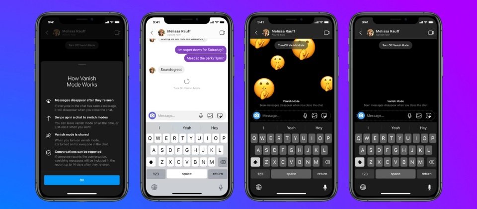 臉書準備同時在Messenger與IG程式上新增消失模式,而且只要在聊天室向上滑動它就會自動進入消失模式,使用者在消失模式中所輸入的文字、照片、影片或貼圖等各種內容,都會在對方看過及使用者離開聊天室後自動消失,不會存留於歷史紀錄中,而再一次地向上滑動即可關閉消失模式。