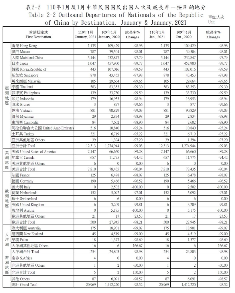 1. Taiwanese went aboard 20,969 times in January 2021, down 98.52% from the 1,412,220 times they went abroad in January 2020 because of the travel restrictions brought about by the COVID-19 pandemic.