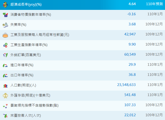 - Real gross domestic product (GDP) in Q4 2020 grew 5.84% from the previous quarter on a seasonally adjusted annualized basis and 5.09% on a year-on-year basis. For 2020 as a whole, real GDP grew 3.11%, and it is expected to grow 4.64% in 2021.110年1月消費者物價指數(CPI)年增率跌0.16%,躉售物價指數(WPI)年增率跌2.86%。