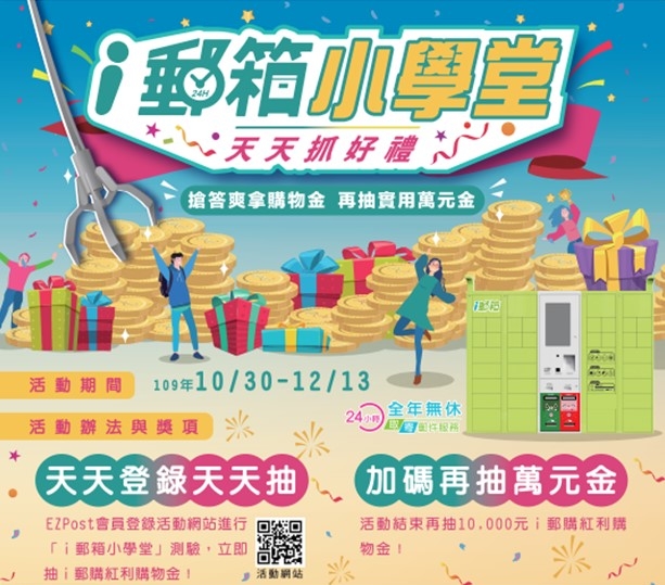 Daily log-in draws: Log in to the activity’s website and answer the system’s random questions (a total of 20 random questions). Answer a question correctly and get a chance to claim a prize – reward points you can redeem on Chunghwa Post’s online PostMall. If you win you will receive immediate confirmation, and the reward points will be sent to you right away.