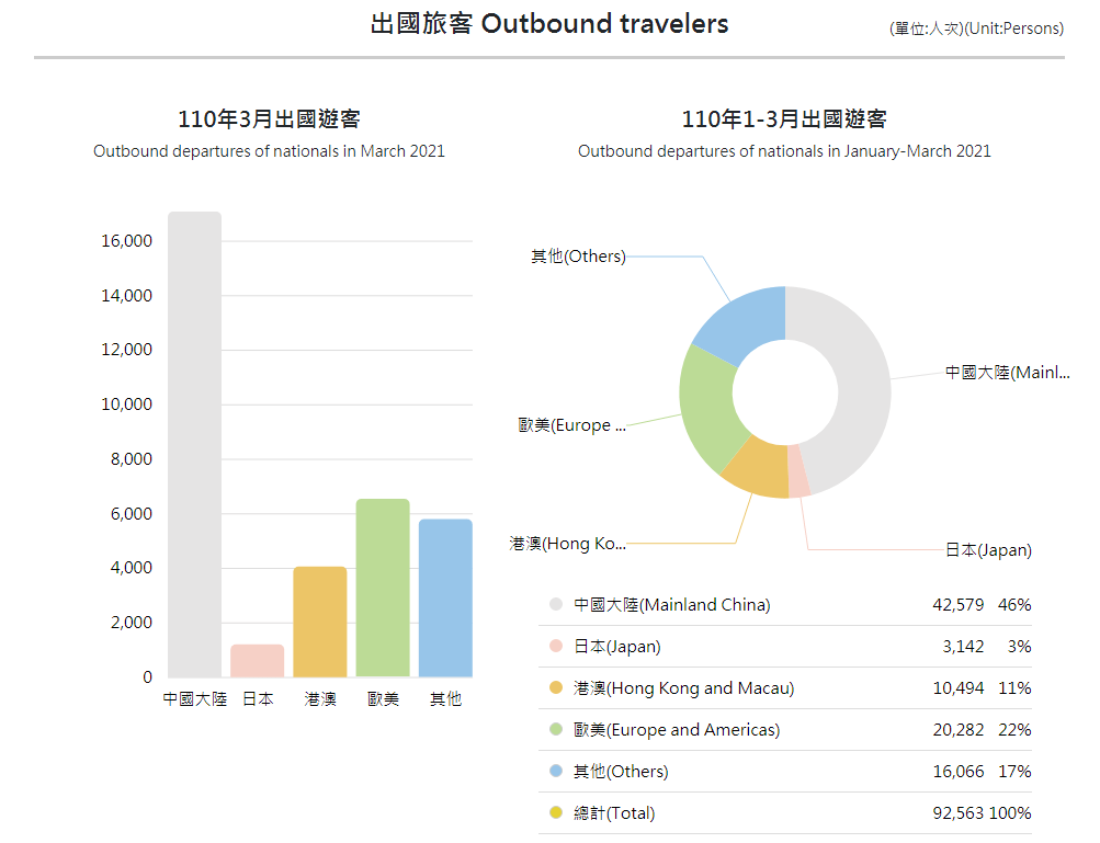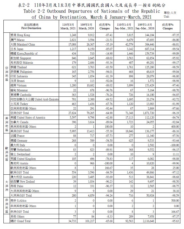 1. 2021年3月出國總人數為34,733人,相較2020年同期101,217人,衰退率-65.68%