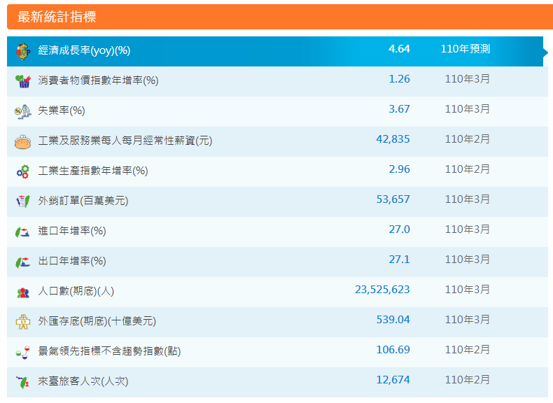 - 主計處重要經濟指標 2021 年 3 月 (部分指標為 2021年 2 月數據)