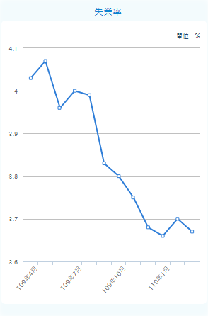 - 110年3月就業人數1,152萬1千人,失業人數43萬9千人,失業率3.67%,季調失業率3.72%,勞動力參與率為59.14%