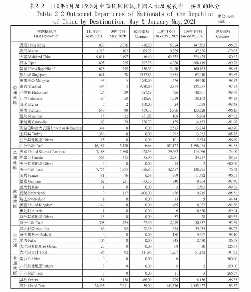 - Taiwanese went abroad 24,495 times in May 2021, up 39.09%from the 17,611 outbound trips taken in the same month in 2020