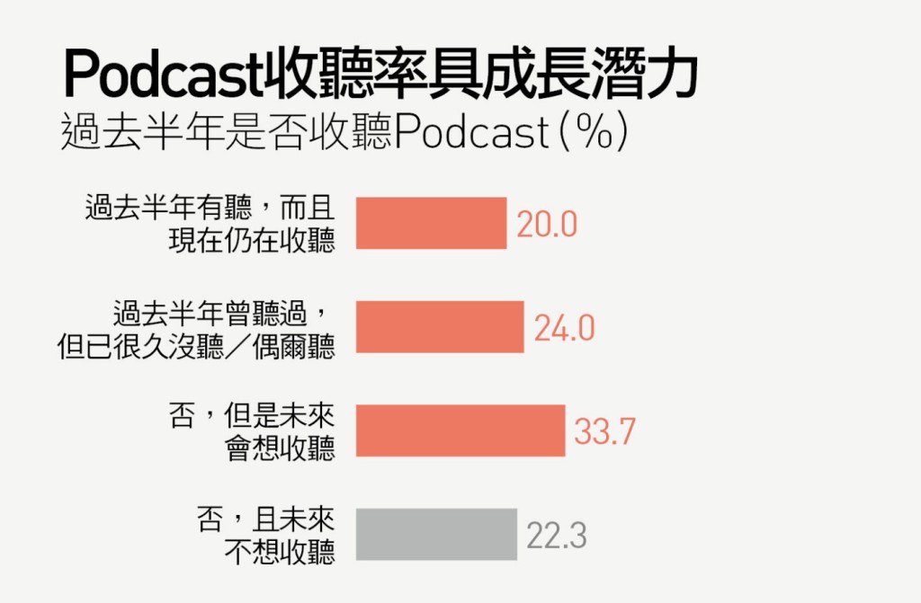 The podcast audience has grown substantially in Taiwan. The study surveyed 1,000 people aged 20 to 59 to investigate their podcast listening habits and usage behaviors. In May, the listening rate reached 20%, meaning, one out of every five people in Taiwan listens to podcasts. The proportion of people who have not listened but will do so in the future was over 30%.