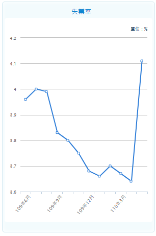 - 110年5月就業人數1,139萬8千人,失業人數48萬9千人,失業率4.11%,季調失業率4.15%,勞動力參與率為58.82%。