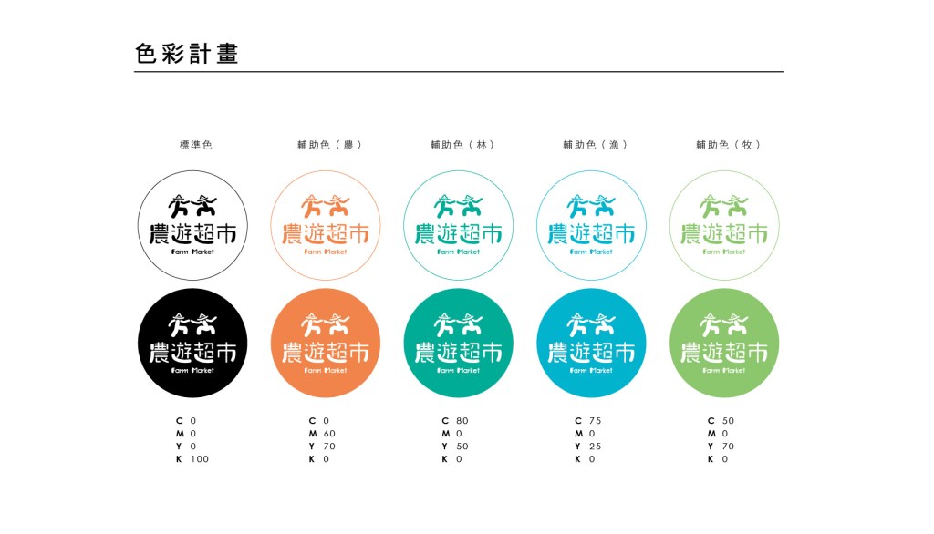 針對「農遊超市」品牌,設計出符合其精神內涵的識別LOGO。農遊顧名思義,以農為本。而農將之擴大意涵,可以解釋為農領域的人。因此在農遊超市的識別設計上,可以看見兩個歡樂的小人,帶著斗笠帽,張開雙手歡迎大家一起體驗農遊樂趣。在字體上使用親繪的古樸墨筆字,帶出全台灣農場主人們親切樸實,又富涵食農知識的人文特色。