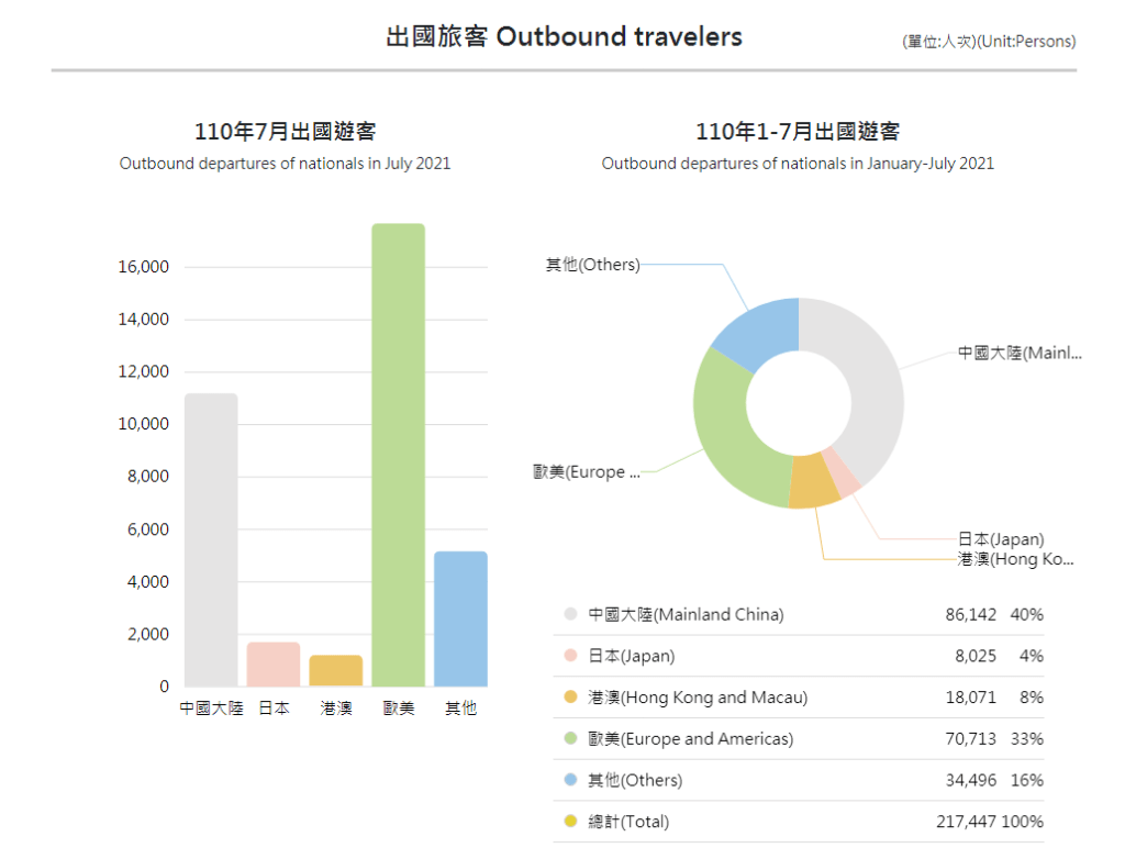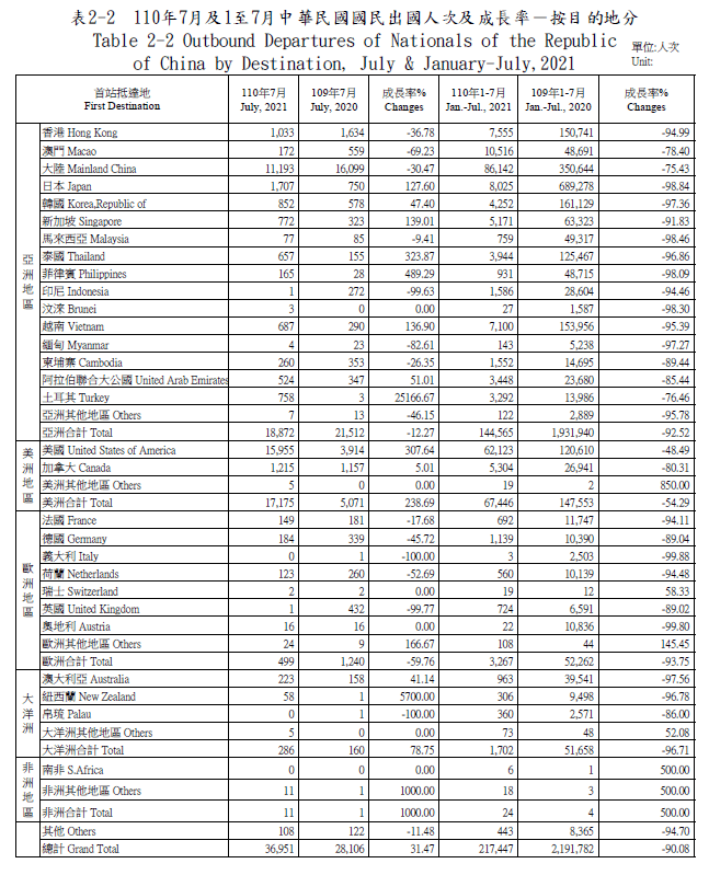 - Taiwanese went abroad 36,951 times in July 2021, up 31.47 %from the 28,106 outbound trips taken in the same month in 2020.