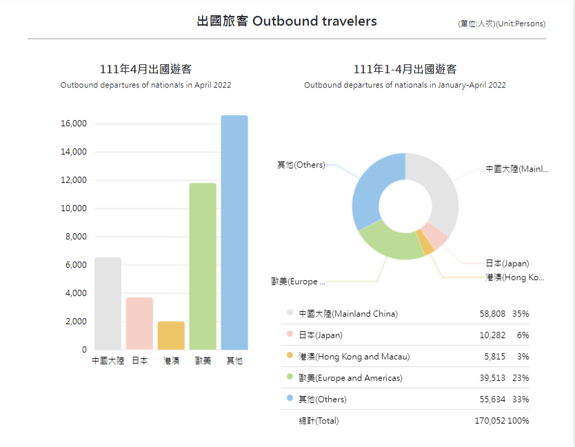 - 111年4月臺灣出國目的地,出國人數第一名的國家為美國,第二名為大陸,後續為越南、日本、新加坡。持續受新冠疫情影響,相較110年同期,成長率最高者為日本293.43 %。