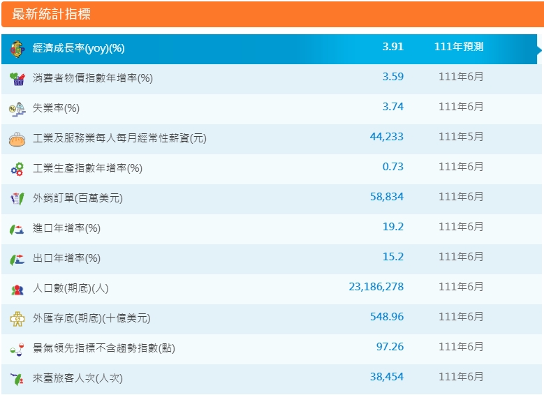 - 行政院主計総処による主要な経済指標 2022 年 6 月(一部は 2022 年 5 月データ)