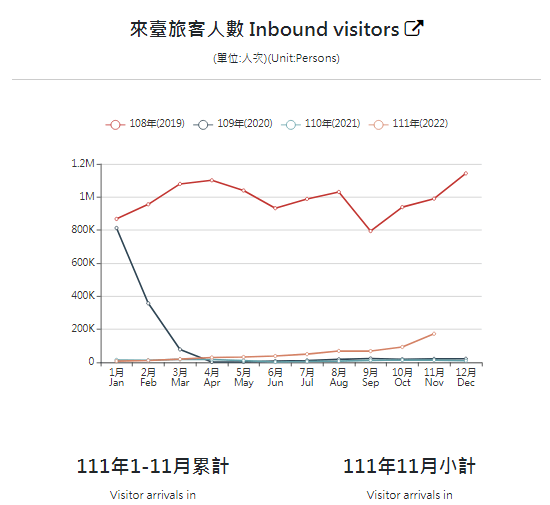2022年11月に台湾を訪れた観光客は173,137人で、前年同期比1186.21%の成長となりました。