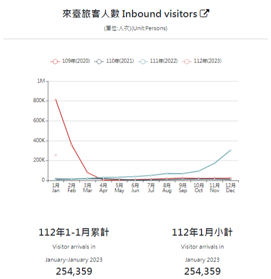 In January 2023, Taiwan had 254,359 inbound visitors, increasing 3229.74% from the same month of 2022.