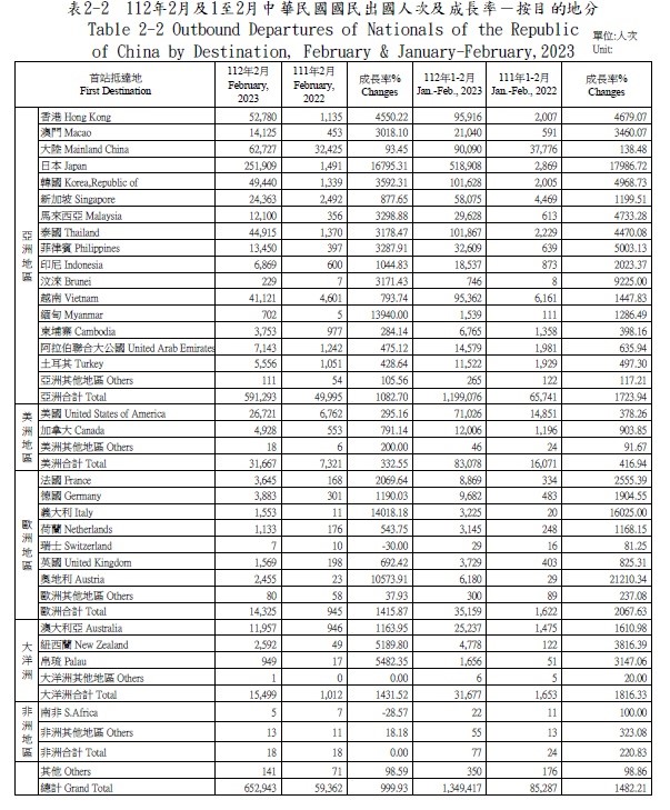 - 652,943 Taiwanese went abroad in February 2023, increasing 999,93% from the same period of 2022 when 59,362 people went abroad.