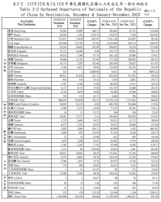 Taiwan Outbound Departure Statistics for December 2023 (Jan. data out March 29th.)
