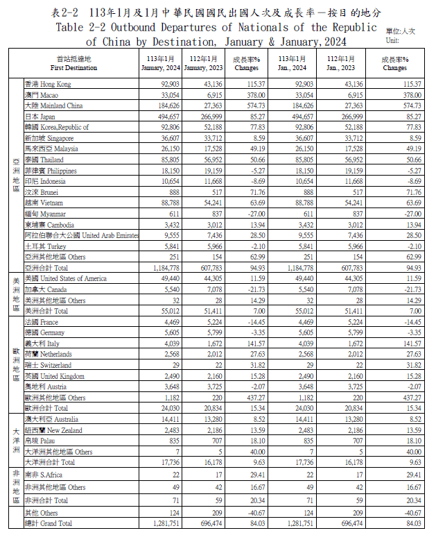 - 113年1月出國總人數為1,281,751人,相較112年同期696,474 人,成長率84.03 %。