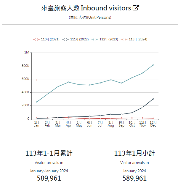 In January of the year 2024, the number of incoming tourists to Taiwan reached 589,961, exhibiting a growth of 131.94% compared to the same period in the previous year (2023).