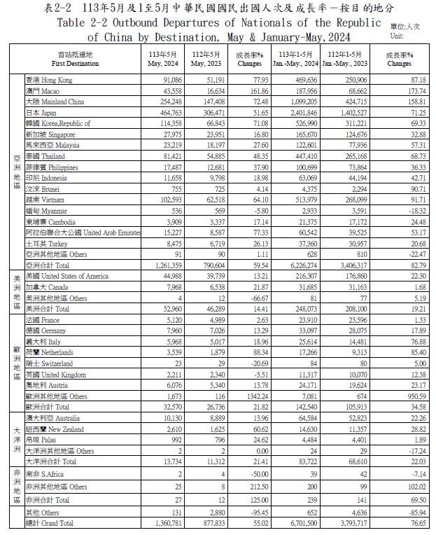 - 2024年5月の海外渡航者数は1,360,781人で、昨年同月の877,833人と比べて55.02%の成長に達した。