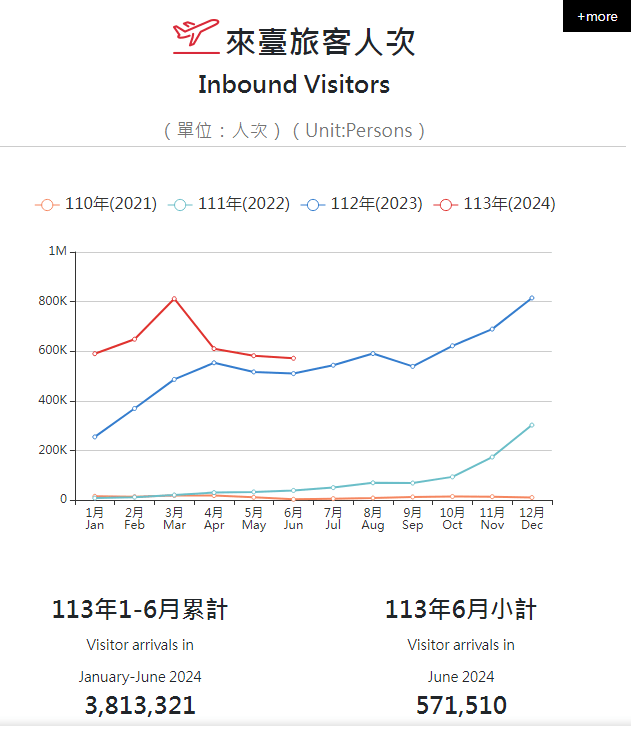 113年6月來臺旅客為571,510人次,與去(112)年同期相較,成長12.13%。