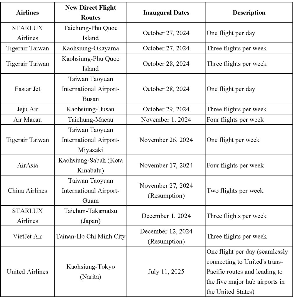● Taiwan’s Recently Launched Direct Flight Routes & Inaugural Dates