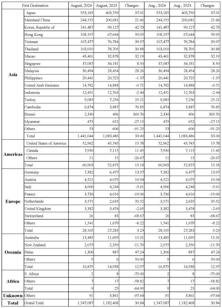 Statistics of Outbound (Destination) Travel by Region, January-August, 2024