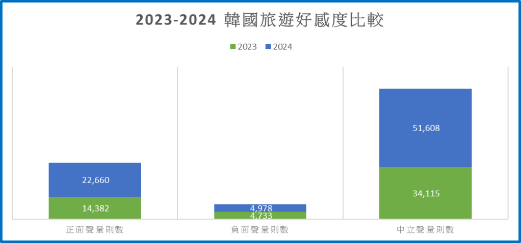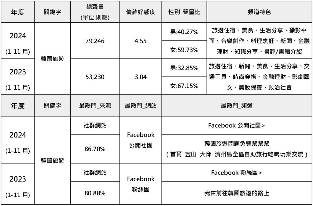 疫情後,2023年台灣前往韓國旅遊的年度人次即近百萬人次(954,693人次),今年1-9月前往韓國已經有1069,168人次,可望超越疫前的高點。本文將2023及2024兩年度的網路輿情熱度,依六大面向分析比較。