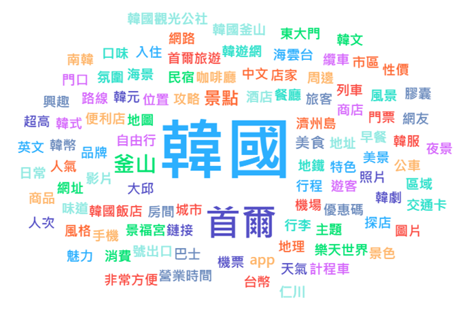 根據擴散分數,釜山的討論度在今年明顯提高不少,緊接在首爾之後、成為台灣消費者第二個喜歡的韓國旅遊景點;大邱、濟州則排名第三及第四名。自由行的討論度也較去年增加,所以,網友也更重視旅遊攻略、民宿及中文交流各項議題。