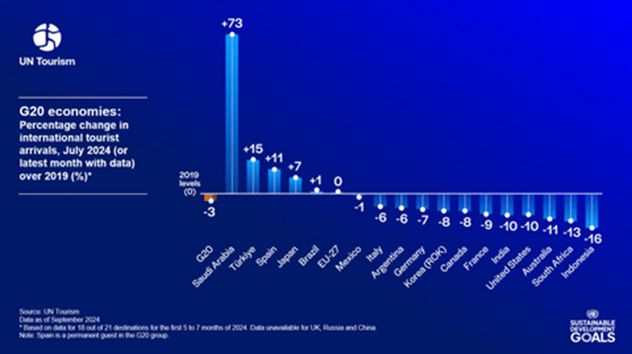 聯合國最新「世界觀光調查報告」指出,與2019年同期相較,前往沙烏地阿拉伯觀光的國際遊客在2024年的前7個月間增加了73%,在G20國家間成長最速。(圖片來源:聯合國旅遊組織)