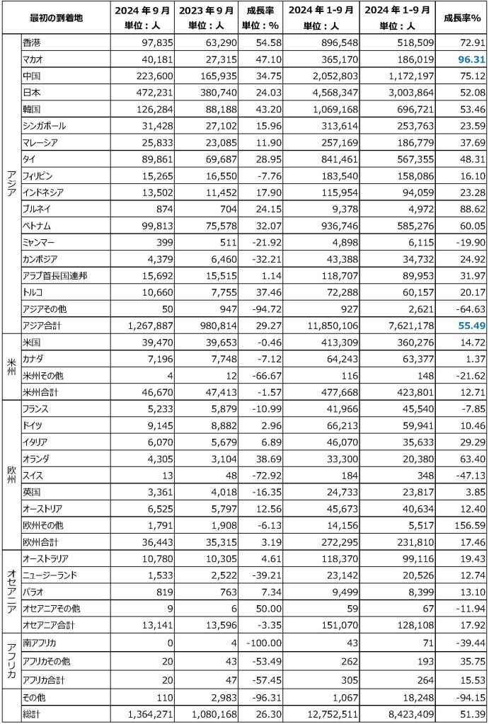 2024年9月 台湾人出国人数及び成長率(目的地別)