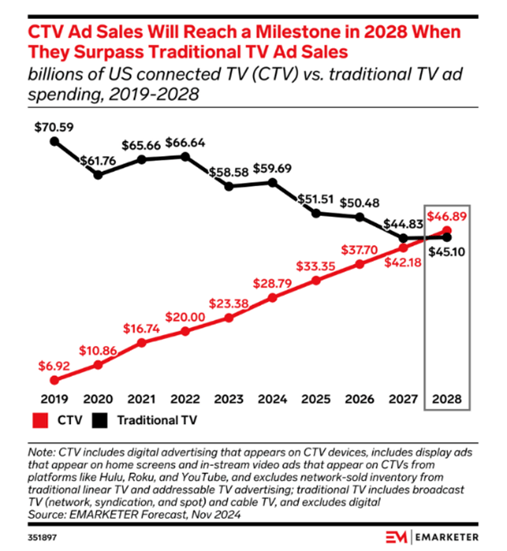 ● CTV廣告即將超越傳統電視,2028 年迎來關鍵拐點!