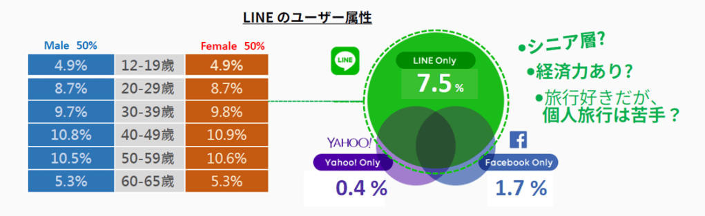 台湾で過去7日間にLINEを使用したユーザーは、12~65歲人口の93%(Facebook は88%)、そのうち7.5%はLINEでしかリーチできないユーザーです。LINE台湾のユーザー男女比は均衡しており、10代から60代以上まで広く利用され、台湾の人口分布とほぼ一致しています。FacebookやYahoo!に比べて、LINEはより経済力のある40歲以上のユーザーにリーチ可能です。