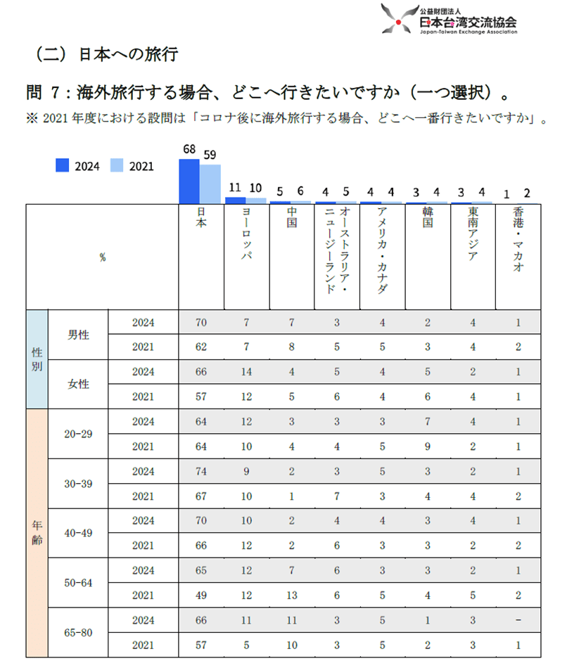 同調査には、「日本への旅行」に関する設問も3問あるが、「海外旅行する場合、どこへ行きたいですか」という設問においても日本が他を大きく引き離し、68%で1位を獲得した。2位以降のヨーロッパ(11%)、中国(5%)、オーストラリア・ニュージーランド(4%)、アメリカ・カナダ(4%)、韓国(3%)、東南アジア(3%)、香港・マカオ(1%)は、全て前回とほぼ同率であるのに対し、日本のみ9ポイント増加している。
