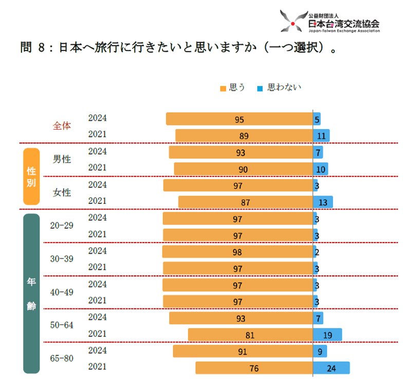 そのほか、日本への旅行意欲に関する設問では、「日本へ旅行に行きたいと思う」が95%を占め、前回調査の89%から6ポイント増加した。年齢別でみると、20代から40代までの層は前回調査とほぼ同じ比率で97%以上を維持していたのに対し、前回は訪日意欲が比較的低かった50代以上でも、今回の調査では、「日本に行きたいと思う」が90%以上に達している。これはコロナが終了し、海外旅行、特に訪日旅行への不安要素がほぼ解消されたためと推測される。