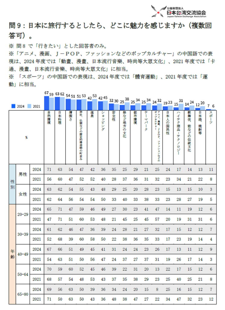 「日本に旅行するとしたら、どこに魅力を感じますか(複数回答可)」という設問では、「自然環境」が67%で1位を獲得、前回1位の「日本料理」は2位(63%)となった。20代から40代までの層では、1位と2位は僅差だったものの、50代以上で「自然環境」が「日本料理」より10ポイント以上高かったことが影響したとみられる。次いで「清潔さ」(54%)、「神社、仏閣などの歴史的建造物の町並み」(51%)、「温泉」(42%)、「ショッピング」(42%)、「安全性」(32%)、「祭など地方の文化」(25%)、「都市環境」(25%)、「テーマパーク」の順となった。