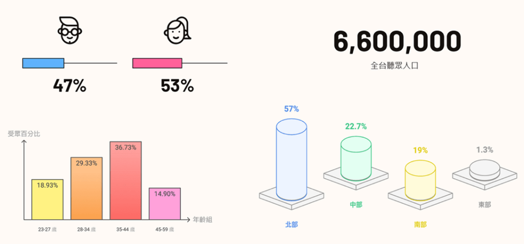 「SoundOn」と「Firstory」が発表した直近のデータによると、台湾におけるポッドキャストのリスナー人口は約660万人、そのうち35〜44歳の層が最多で、次いで28〜34歳の層となっており、青年層と壮年層が主要リスナー層であることがわかる。男女比では、女性の割合がやや高くなっている。地域別では、台湾北部での割合が高く、都市部での聴取人口が多い傾向にある。