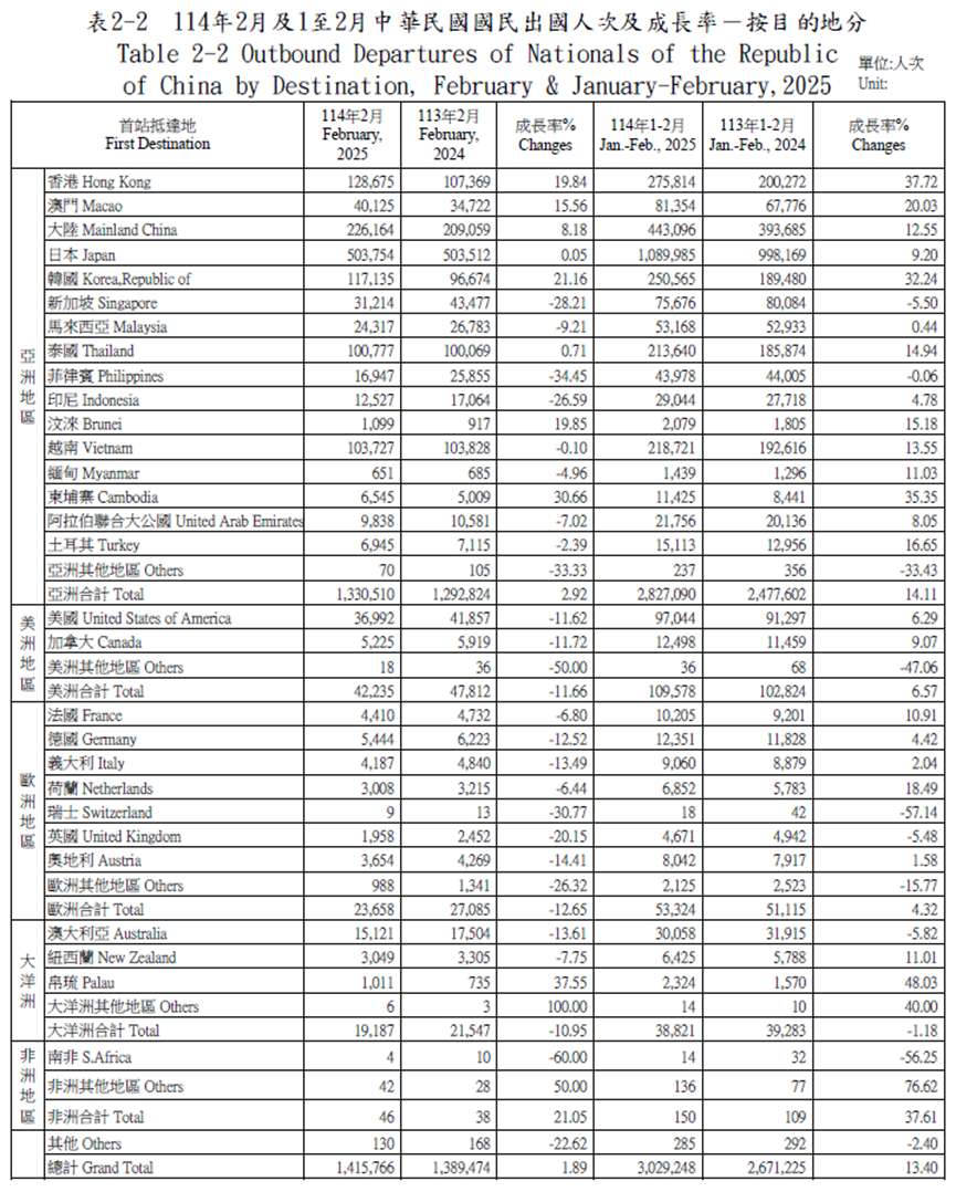 114年2月及1至2月中華民國國民出國人次及成長率-按目的地分