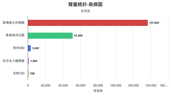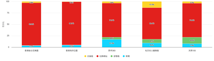 - 社群網站:整體來源中,社群網站佔比最高,五個景點皆超過 69%,尤其香港海洋公園與香港迪士尼樂園社群討論量最為集中(超過 93%)。其中,在香港迪士尼樂園的「門票買一送一」優惠引起廣大討論,包含抽獎活動及各類優惠宣傳;YouTuber旅遊的影片也掀起不少討論聲量,如見習網美小吳的〈香港快閃!必玩海洋公園〉篇高達50萬觀看次數,吸引超過9500則留言。