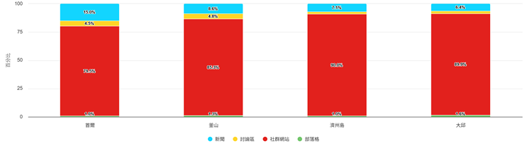 Forum mentions were relatively evenly distributed among the four cities, with Busan slightly leading at 4.8%. These posts mostly appear on platforms like PTT and Dcard, where users share practical travel advice, ask questions about itineraries and transportation, or offer accommodation recommendations. This category is generally more function-oriented and question-driven. - Blogs: