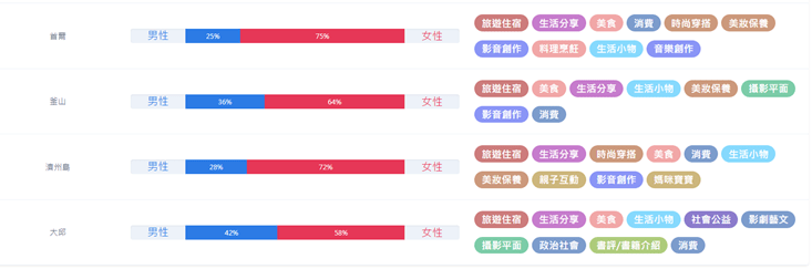 - Busan exhibits a more balanced gender distribution, with 64% female and 36% male. Like Seoul, its top tags are centered on “travel & accommodation,” “food,” and “lifestyle sharing.” Notably, tags such as “photography” and “video production” also appear, highlighting Busan’s appeal to users interested in visual arts and creative content. As a destination that combines coastal scenery and urban charm, Busan draws a broad range of attention across gender lines and content types.