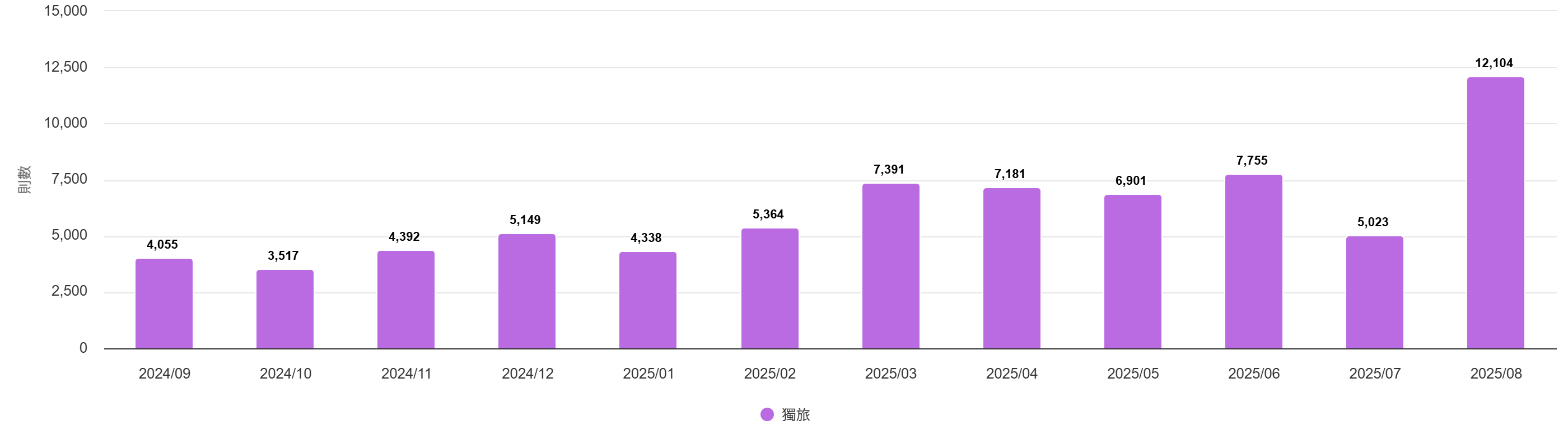 過去一年「獨旅」相關網路聲量整體呈現上升趨勢,顯示大眾對於獨自旅行的興趣逐漸增強,「獨旅」正在成為熱門話題,甚至形成一股旅遊風潮。「獨旅」已經從小眾興趣逐漸成為一種主流旅遊型態。