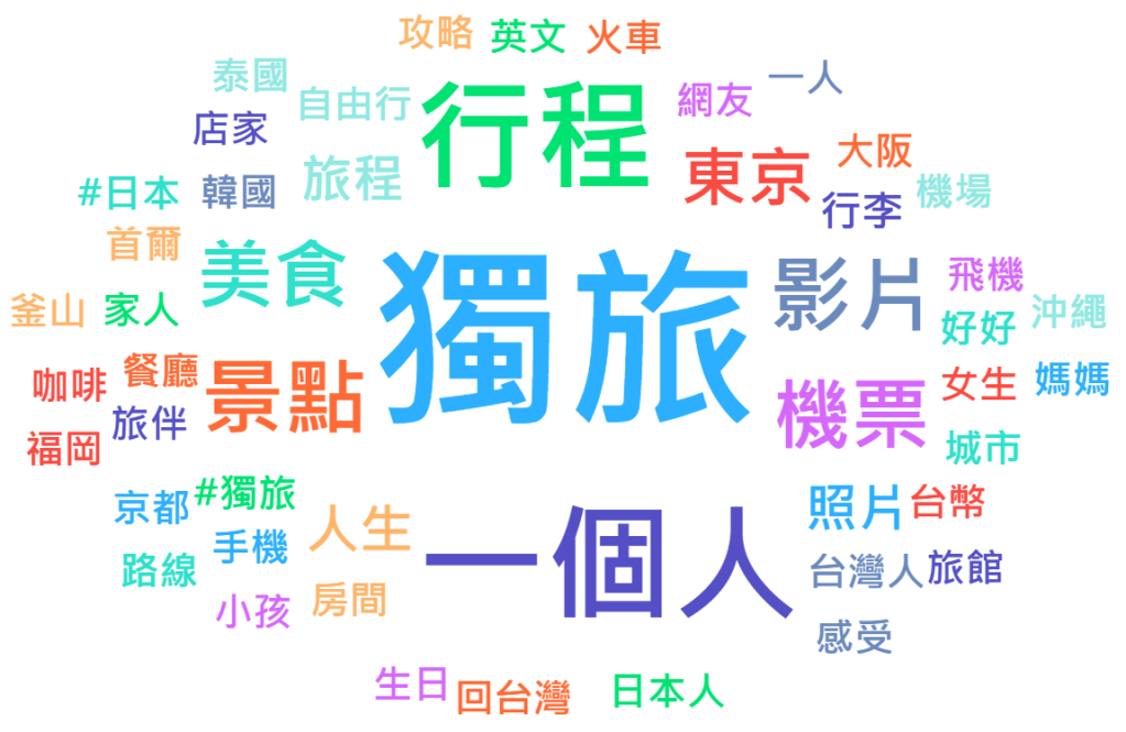 「美食」、「咖啡」、「餐廳」等詞反映獨旅族群常以品嚐在地飲食作為重要體驗。不僅是旅程的一部分,也帶有生活風格的分享價值。