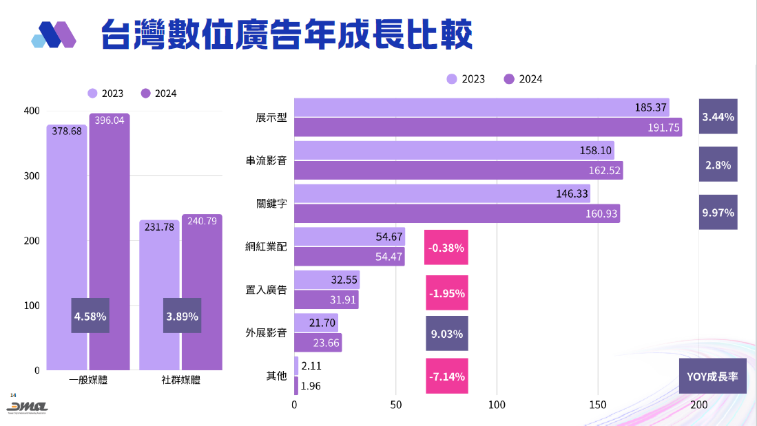 在各類型廣告中,受惠於旅遊娛樂產業復甦、境外電商品牌的積極投資,以及AI廣告自動配置影響,關鍵字廣告為去年成長最多的類型,成長率為 9.97%。