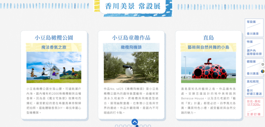 分為常設展(香川美景)、特展(2025瀨戶內國際藝術祭)、體驗展(香川美食)
