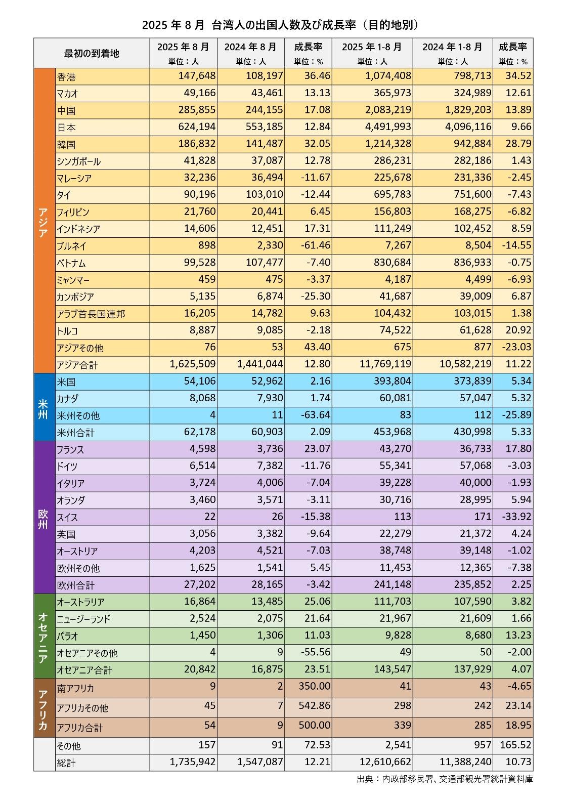 2025年8月 台湾人出国人数及び成長率(目的地別)