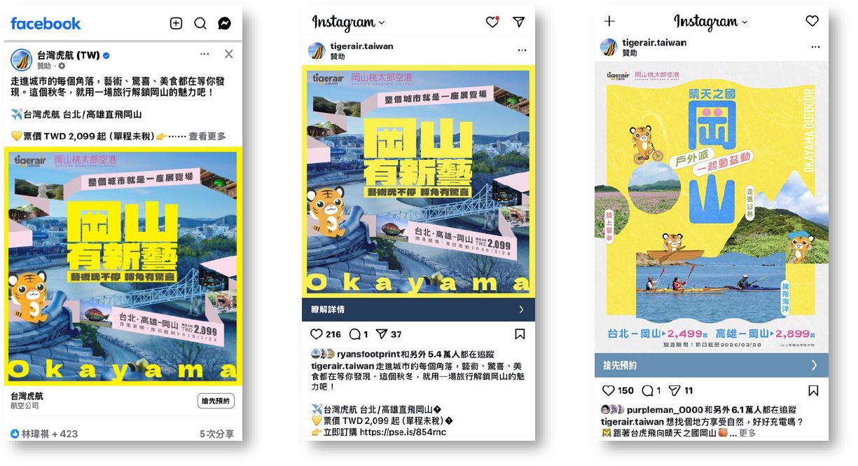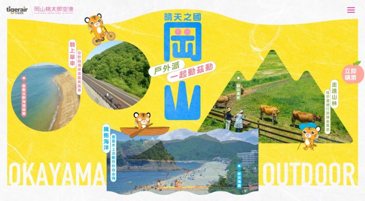 タイガーエア台湾による岡山旅行プロモーションを担当。「アート」をテーマにした第一弾は2025年9月中旬~10月下旬に実施、「アウトドア」をテーマにした第二弾は、2025年12月中旬~2026年1月下旬に実施した。比較的長期に渡ったプロモーション期間では、ランディングページとデジタル広告を通じて航空券の販売促進を図ると同時に、KOLによる現地取材・情報発信、旅行・ライフスタイルメディアでの記事広告出稿、さらにはラッピング電車の運行など、「タイガーエア台湾で行く岡山旅行」への認知度・好感度を向上させるため、様々な手法による多角的なアプローチのプロモーションを実施した。
