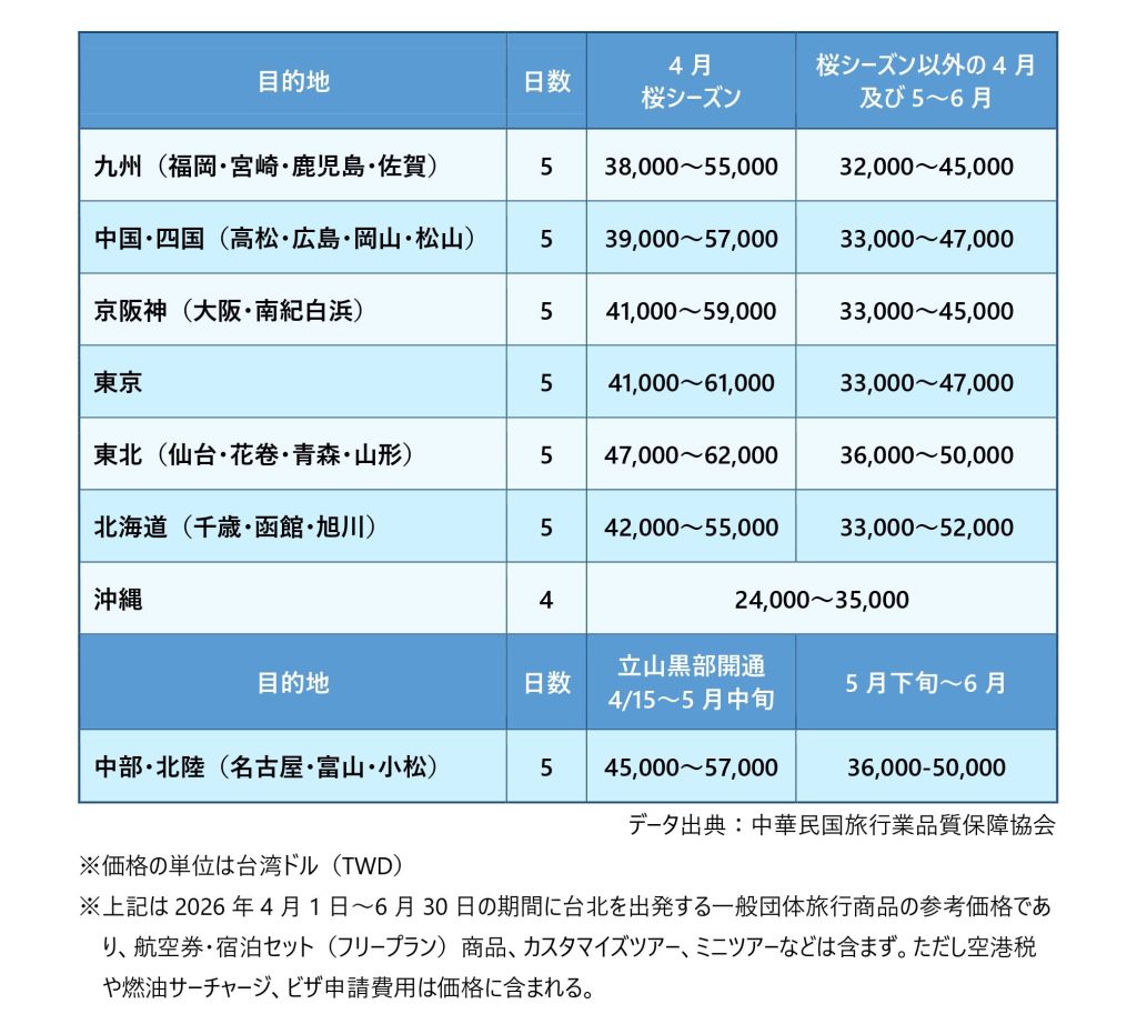 同協会によると、北海道と東北地方方面のツアー料金は、2026年第1四半期より引き下げられた。東北地方の樹氷シーズンや流氷砕氷船の運航が終了したことなどが影響しているとみられ、価格は約15~20%下落した。日本のその他の地域では、ツアー料金は第1四半期と比べ、概ね1,000~2,000台湾ドル程度の値上げとなっている。第2四半期は、桜や藤の観賞、立山黒部アルペンルートの開通など、特に人気の旅行コンテンツが楽しめる時期ということもあり、現地の旅行会社もこれらをセールスポイントとして販売を強化している。