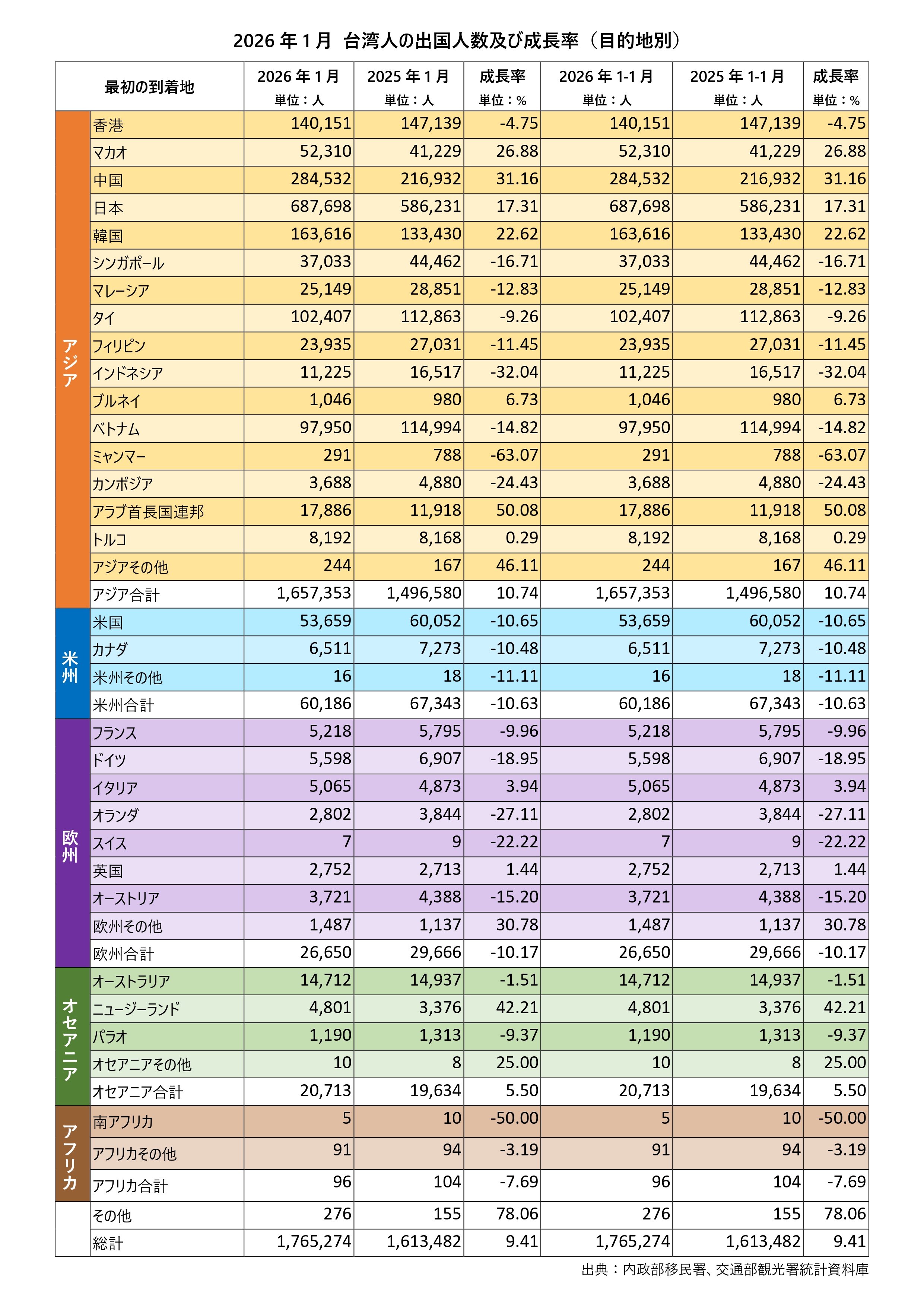 2026年1月 台湾人出国人数及び成長率(目的地別)