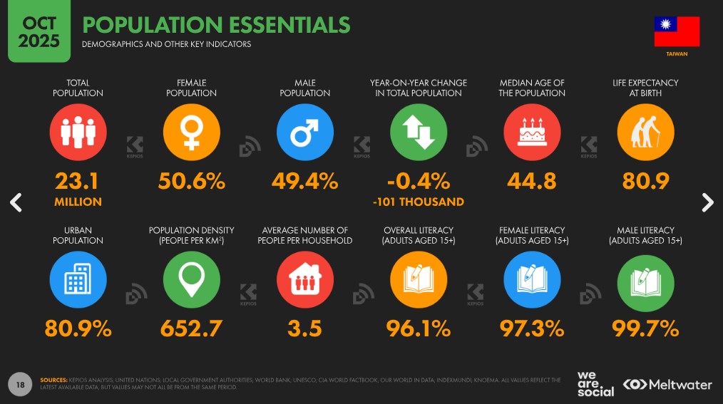 台湾市場のデジタルトレンドに関する年次報告書「Digital 2026: Taiwan」が、2025年11月にDatareportalプラットフォームで公開された。データは主に2025年10月時点のものが使用されている。以下の内容では、台湾メディアによる同レポートの分析内容を整理・掲載する。