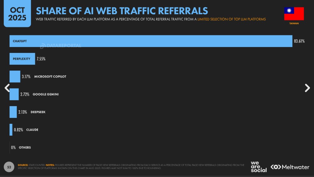 台湾におけるGoogleの検索市場シェアは、2年前の90%以上から84.9%まで低下した。台湾のユーザーはChatGPT、Perplexity、GeminiなどのAIサービスに直接質問をするという利用方法に慣れつつある。今回のレポートでは、WEBサイトへのトラフィックを最も多くもたらす大規模言語モデル(LLM)プラットフォームはChatGPTで、インターネットにおけるAI検索の中で83.61%を占めている。
